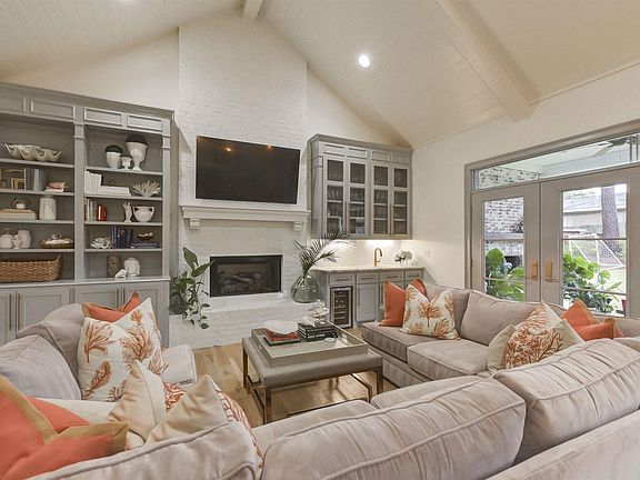 - RoomLivingRoomFeatures: Fireplace, French Doors, Floors-Hardwood, Molding, Books, Ceilings-Cathedral, Ceilings-High (over 9 Ft), Ceiling Fan, Recessed Lights, Wetbar, Beams