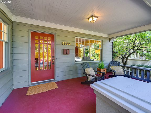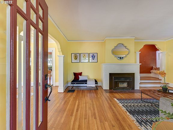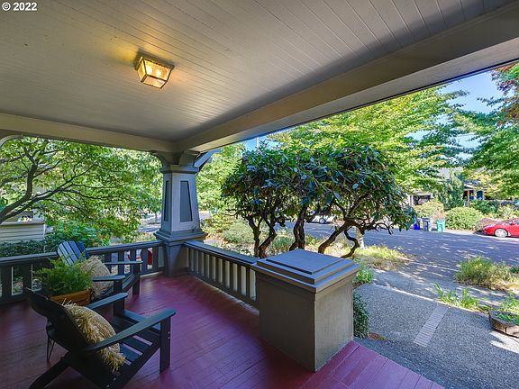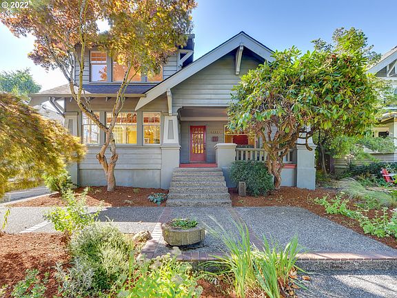 Craftsman in great location! Welcoming porch. LR w/top-nail hardwoods, wood stove, lead windows. Formal DR w/box beam ceiling + French doors to sunroom. Kit w/quartz ctrs, range, fridge, DW + loads of storage. Nook w/blt-in seating. Bonus/office/4th bedrm w/new carpet + French drs. Half ba. Up is 3 bedrms-all w/wood flrs + WI closets. Full ba w/tub/shower + tile flr. LL full basement, partial finish, laundry, storage. Yard has raised beds + patio. NEW paint/carpet/deck stairs, patio. [Home Energy Score = 2. HES Report at https://rpt.greenbuildingregistry.com/hes/OR10205119]