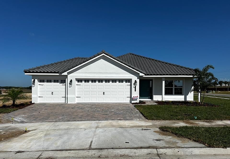 Under Construction. This 2200 Sq ft home has 4 bedrooms and 3 baths, 3 car garage, lots of entertaining space and luxurious details throughout! Upon entering you will enjoy the open concept great room/dining room/kitchen with 10’ ceilings, wood look plank tile in main areas, granite countertops throughout, 5 ¼ inch baseboards, wainscotting in dining room and much more. The owner suite is spacious with Tray Ceiling w/crown molding. Ensuite has double sink vanity with extra storage drawers, linen closet, tile separate shower w/glass door, nice tub, etc. The home also has a second owner suite with ensuite and a large walk-in closet. 2 other bedrooms in the home share a oversized bath with linen closet, tub-shower combo, separate toilet, double sink vanity with storage drawers. The exterior of the home has a tile roof and patio paver driveway, and patio paver covered lanai. This community is gated, has a gorgeous clubhouse with fitness center, pool overlooking the lake, basketball court, tennis court, playground, and community boat ramp. Photos are of a finished 2200 . Actual colors and finishes may vary. This is a must see home.
