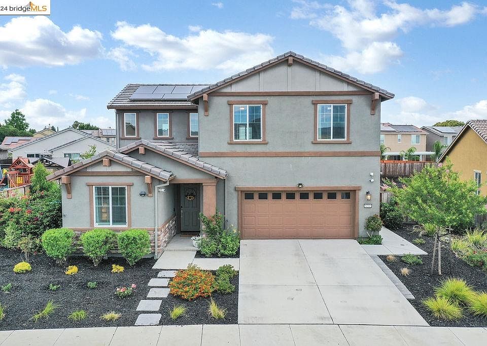 Wow! This one is Better than new because it's all already done! Window coverings; back yard landscape; lots of upgrades And a 12/x16 finished shed with electrical and A/C! This home has something for everyone! Downstairs bedroom with walk-in closet and full bathroom. Kitchen features large walk-in pantry and huge island. Large loft at the top of the stairs. Nice, big laundry room. Oversized garage with built-in cabinets, epoxy floor and power bank! This is one of the largest lots in the neighborhood. Enjoy the garden beds, numerous fruit trees, play structure and pergola. Owned solar! Walk to the park. Close to shopping and schools. Easy access to Hwy 4 and just minutes to Antioch BART. 3D walkthrough: https://my.matterport.com/show/?m=Vd6hrT7ALaK&brand=0