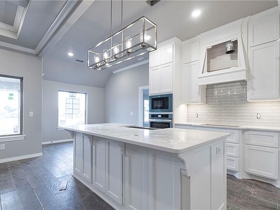 This Sage Bonus Room 2 floor plan features 2,550 Sq Ft of total living space, which includes 2,300 Sq Ft of indoor space and 250 Sq Ft of outdoor living. There is also a 625 Sq Ft, three car garage with a storm shelter installed. This home offers 4 bedrooms, 3 full bathroom and a bonus room! The living room features a noteworthy coffered ceiling, a beautiful fireplace with stacked stone surround, & large windows to bring in natural light. The kitchen has decorative tile backsplash, built-in stainless steel appliances, well-crafted cabinets to the ceiling, 3 CM countertops, a corner pantry, and a large center island. The primary suite boasts an extraordinary, sloped ceiling detail, a generous walk-in closet, a double sink vanity, a whirlpool tub, & a walk-in shower! The covered back patio offers a wood burning fireplace, tv and cable hookups, and a gas line! This home also features smart home technology/security, whole home air purification system, and a Rinnai Tankless water heater.