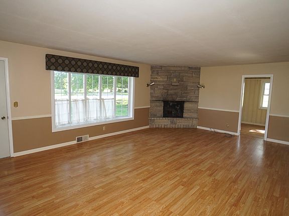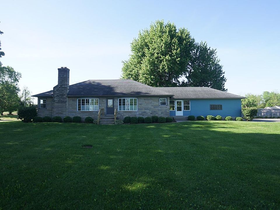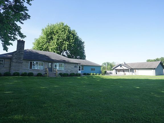 Nice Bedford stone/wood sided ranch home situated on 2.56 acres with a large Morton building & in-ground pool. Pole building is partially finished for pool house with bar and a full bath. Home has new carpet in bedrooms, some new paint and new stove. Tile floors in kitchen. Fireplace in family room. Office could make a 4th bedroom. Zoned business.