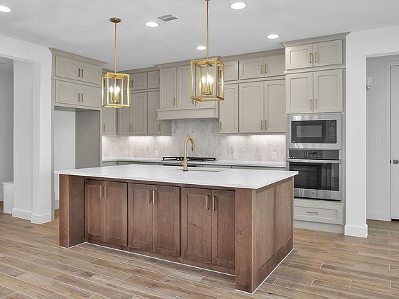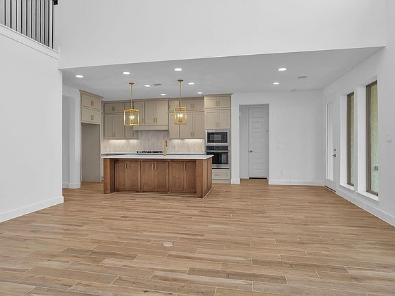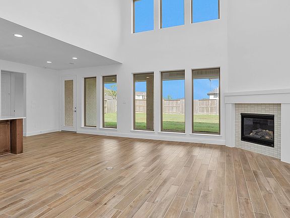 READY FOR MOVE-IN!!- Curved staircase highlights two-story entry. Home office with French doors and formal dining room set at entry. Two-story family room with wall of windows and corner wood mantel fireplace opens to kitchen and morning area. Kitchen features walk-in pantry, two wall ovens, 5-burner gas cooktop and island with built-in seating space. First-floor primary suite with wall of windows. Dual vanities, freestanding tub, separate glass-enclosed shower and two walk-in closets in primary bath. First-floor guest suite offers private bath. A game room, media room and three secondary bedrooms are upstairs. Extended covered backyard patio. Three-car garage with additional garage bay space.