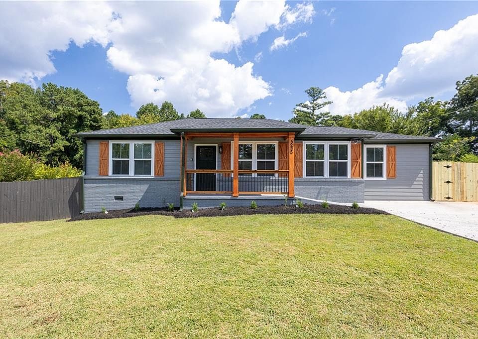 Fully renovated ranch in prime Mableton location! Stunning 4-bedroom, 3-bathroom home, thoughtfully renovated from top to bottom to blend modern style with everyday comfort. Situated on a level lot with a fenced backyard, this home offers low-maintenance living in a convenient and desirable location. Step inside to discover hardwood floors, crown molding, and neutral paint throughout the open-concept living area, where abundant natural light shines. The brand-new eat-in kitchen features an island, soft-close cabinetry, and new stainless steel appliances. The primary suite has a charming beamed ceiling, custom walk-in closet, and a luxurious ensuite bathroom boasting a double vanity, tile shower, and soaking tub. The thoughtful roommate-style floorplan offers two bedrooms with walk-in closets that share a full bath, plus a third bedroom with its own private bath—ideal for guests or multi-generational living. Enjoy outdoor living on the wood deck overlooking the fenced backyard, with plenty of space for pets, play, or gatherings. Additional highlights include a new detached two-car garage, large driveway with ample parking, and all new systems—HVAC, roof, water heater, vapor barrier, and windows—for total peace of mind. Located just minutes from shopping, restaurants, and local attractions, you can walk to concerts and events at Mable House Barnes Amphitheatre. This home truly combines style, convenience, and a vibrant lifestyle. Square footage is approximate.