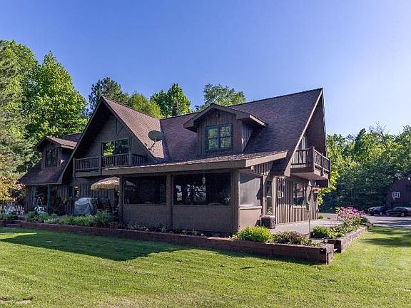 385 feet level frontage (650+/- meandering) with 8.50 acres on the Manitowish Waters Chain! Plenty of room with this 4BR, 3BA Chalet style year 'round home plus a 1 plus BR, 1 BA guest house! Cedar sided home has LR right off the Kitchen with beautiful custom cabinetry, granite counters and breakfast bar which is open to the dining room w/sliding doors to the lakeside deck Family room offers built in bar and fireplace and opens to the lakeside screen porch and wrap around deck. Main floor also includes MBR suite, 2nd full bath and laundry room. Upper level has 3 spacious bedrooms and full bath. 1 plus bedroom, 1 bath guest quarters are over the 5 car detached heated garage, which includes hot tub room and work out room! The walk to the lakefront is level and includes a great firepit and permanent pier. TONS of room with the acreage, sellers used to have a horse and there is an older barn w/stall ready. This is a great opportunity for a gorgeous level and private property on the Chain!