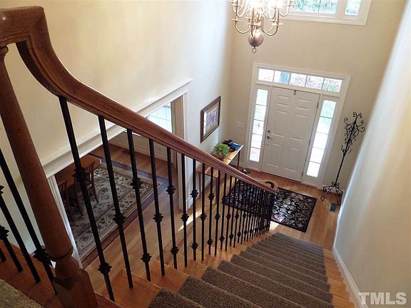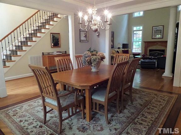 Custom ALL Brick Hm w/inviting front porch leads to 2 sty foyer.Hardwoods downst-formal Dining w/ wainscotting open to 2 sty Fam w/gas log FP & windows view wooded bkyd. brkfast w/bay-Gourmet kit w/gas range, generous cabs/granite counters, & island. Downst Master Ste w/Lg spa w/sep shower/whirlpool, dual vanity. Up is guest bd/bath, bd2/3&buddy bath, bonus w/ bk stairs. Unf storage ready 4 Ofc/bath. Roof '17-Oversize Garage w/work area.Entertaining Deck.Subdv w/amenities w/Apex Schools-only wake taxes.