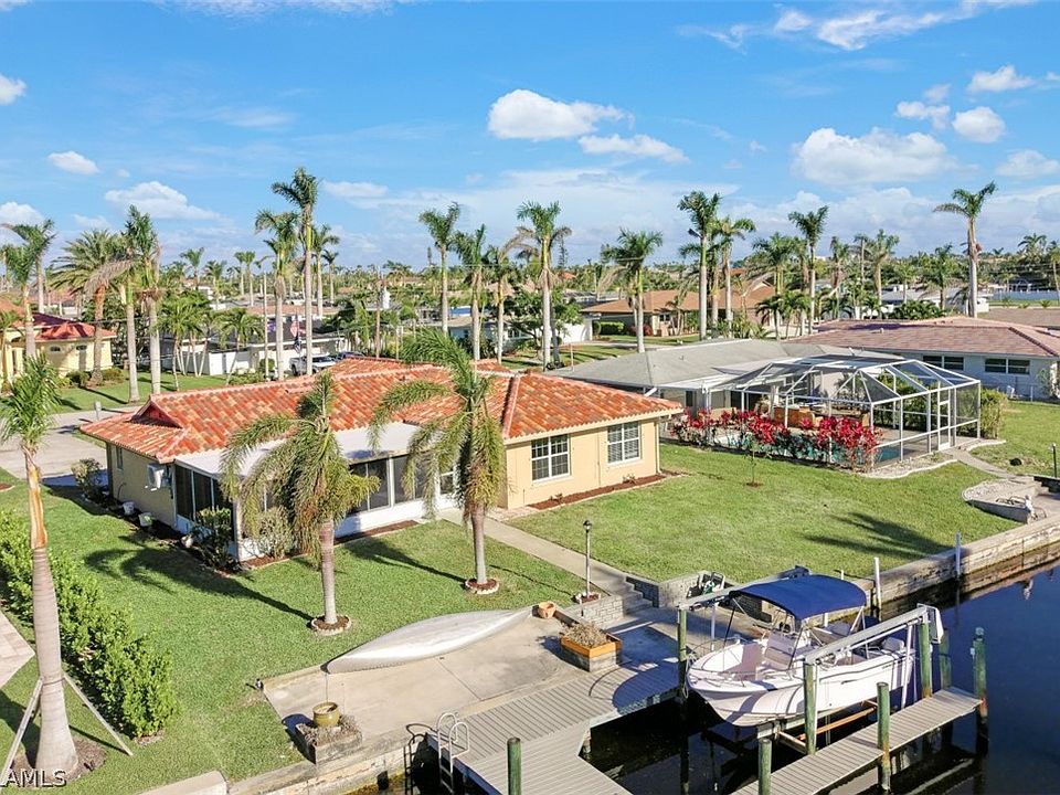 Motivated Seller with an assumable mortgage! Move-In Ready,Renovated, and Direct Gulf Access... this home is a boater's dream with NO BRIDGES just minutes to open water! 5,000 lb. boat lift with Captain's Walk. Located in Cape Coral Yacht Club, a highly desirable area which is quiet, close to the beach, downtown, the best restaurants and shopping. Home has 3 bdrms+ den, 2 full baths & a HUGE enclosed south-westerly lanai with year-round sunshine and sunset views. Recent improvements include: New Tile Roof (2022), HVAC (2022), New Electric Panel / Repiped Plumbing / Water Heater (all 2018), new flooring and updated light fixtures. Beautiful & functional kitchen with brand new Cabinets, Granite Countertops and Samsung Stainless Steel Appliances (2022). You'll love the enclosed and air conditioned lanai (or "Four Seasons Room") which has a brand new mini-split AC (2022) and two sets of sliders which pocket into the walls to completely open and expand your living space for entertaining. Split floor plan with nicely sized guest rooms. Owner Ensuite Bath has an amazing multi shower head & rain fall options, dual sinks, walk-in closet and glass panel barn door. Schedule your tour today!