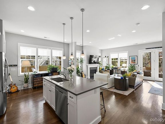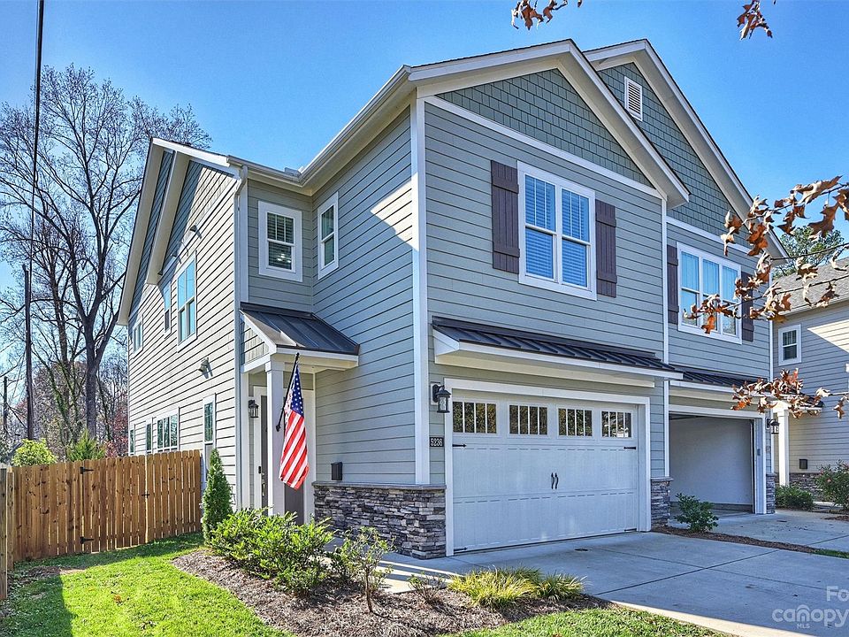 Prime location and incredible low-maintenance lifestyle. This duet-style townhome is a true unicorn! Backs to Little Sugar Creek Greenway, close to Park Rd Park, Montford, Harris Teeter, Mugs Coffee, & other dining! Built in 2020, this home lives & feels like a single family home w/10' ceilings down & 9' ceilings up, large Jeld-Wyn windows w/ motorized shades, walk-in closets in every room, a 2-car garage with add'l parking in driveway, & a massive patio overlooking the professionally landscaped, fenced back yard. Open floorplan with large kitchen island, living room with gas fireplace, and dining area. Hardwoods continue upstairs and through the hallway leading to huge primary suite with 3 closets & covered balcony. Beautiful tile in primary bathroom, dual sinks & water closet. Both secondary bedrooms have walk-in closets & ceiling fans. Truly one of the best townhomes you'll find in Charlotte, with an incredible yard, in one of the most fun & convenient locations imaginable!
