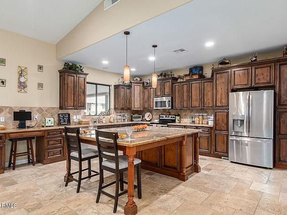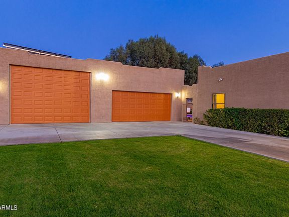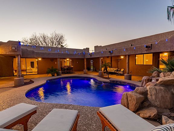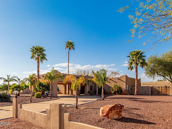 Outstanding Custom Territorial Home w/a circular driveway & mature desert landscape. No HOA neighborhood. Spacious open floor plan, beautiful stone floors, welcoming color palette, plantation shutters, leased solar. Stunning chef's kitchen features a large center island, granite counters, breakfast bar, SS appliances, built-in desk, pantry, & plethora of handsome wood cabinetry w/crown molding. Bonus casita w/a kitchen, bedroom, & bath. Private den. All 5 bedrooms have their own baths, plush carpet, & walk-in closets. Sparkling pebble tec pool, w/a waterfall, wrap-around covered patio, lush green landscape, & raised garden planters. Temperature controlled RV garage, two attached, & two separate car garages. Perfect home for entertaining inside & out!