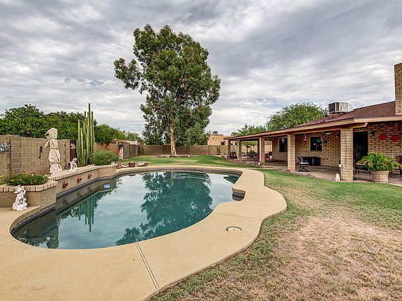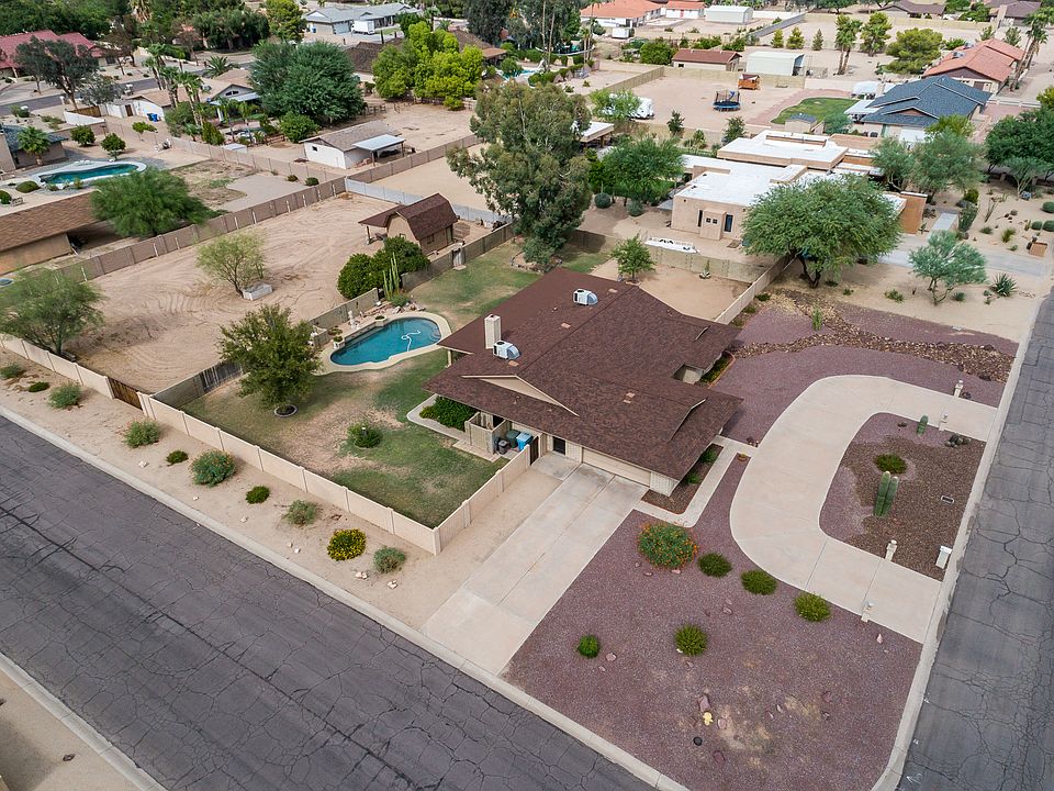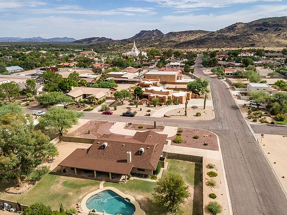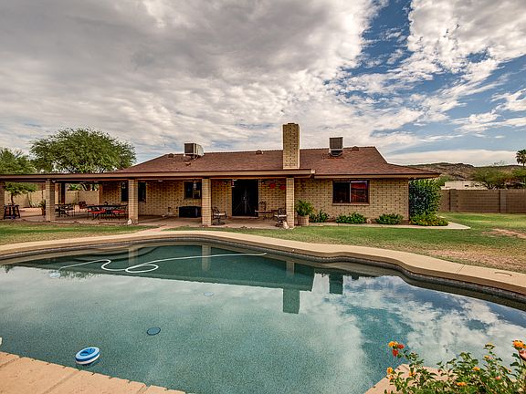 North facing backyard with mountain views, on nearly 1 acre! Solid Brick, Single level, 4 (Large ) Bedrooms home. Split floor plan, Wood Blinds, Huge Pebbletec pool. Immaculate, well kept home with 800 sq ft covered rear patio for entertaining. Oak Cabinets in the kitchen and bathrooms. Roof completely redone, underground sprinklers, ceiling fans throughout, Dual AC, Dual pane windows, beautiful steel screen doors throughout and stunning T111 ceilings. Tack/storage building also on property. RV Gate for all the toys. Walk to Thunderbird Mountain hiking trails or 500 Golf Club!