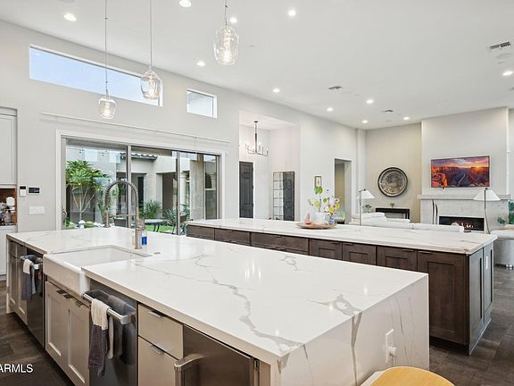 Inside the main home, ceilings rise above a modern living area anchored by a stunning floor-to-ceiling fireplace. The gourmet kitchen is a true showpiece, built around two sixteen-foot islands and extensive custom cabinetry with interior pull-outs, appliance storage, and a complete coffee and wine bar.