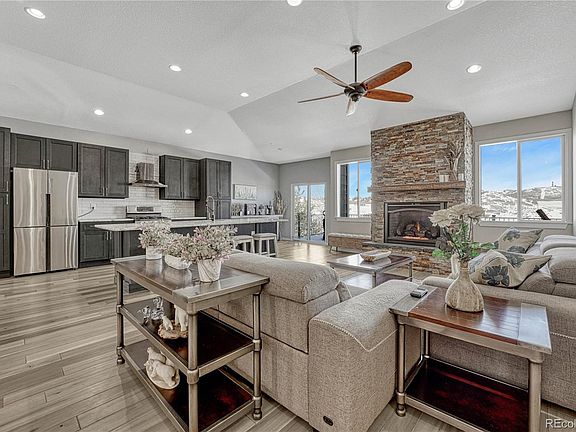 Upgraded Ranch style home on huge corner lot backing to greenbelt and open space! Serene views out east behind this premium lot location, with the HOA greenbelt and community trail right behind this property. Professionally landscaped front and back yard, fenced backyard, new lower level concrete patio with hot tub (included with the house!), and new composite upper deck - with ambient lighting and metal railing - that runs the entire length of the house. Covered stamped concrete front porch, 3 car attached garage with attached shelving, Central AC, low HOA dues that include use of the community fitness center, pool and park. The main level of the house features a Main Floor Primary Suite with coffered ceiling, 5 piece bathroom and walk in closet; secondary bedroom with accent wall and crown molding'; full bathroom' dining room with upgraded chandelier, french doors and custom antique barn doors; laundry room with shelving; family room with gas fireplace, rock accent wall, mantel, upgraded ceiling fan, and vaulted ceiling; and kitchen with oversized island with sink, upgraded fixtures, leathered granite counters, extended cabinets, 5 burner gas stove/oven, subway tile backsplash, and coffee bar. The fully finished walkout basement has another bedroom, bathroom, and a huge rec room. Basement refrigerator is included and the sliding glass doors are upgraded. Close to Downtown Castle Rock, easy access to I-25 (there is a new exit being built right at the entrance to Crystal Valley Ranch!), and part of the nationally recognized Douglas County School District.