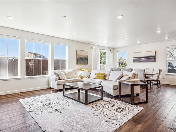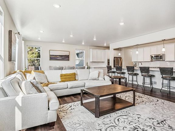 Stunning contemporary 2-story home with optioned main floor mother-in-law suite offers the ultimate in indoor/outdoor living in Thornton’s sought-after Willow Bend. This spacious Lennar home includes beautiful luxury vinyl plank flooring, high ceilings, and a neutral palette that seamlessly ties together the main living spaces. Flooded with natural light, the open-concept living space opens effortlessly to your own backyard oasis. Enjoy family get-togethers and dining al fresco on the large stamped concrete patio with a built-in gas firepit, overlooking a fenced and landscaped yard. The well-appointed kitchen boasts upgraded white cabinetry, a stainless steel appliance package, a large pantry, and an oversized center island with ample bar seating. Retreat to your primary suite which includes an upgraded 4-piece bath with a walk-in shower, and a massive walk-in closet with a custom storage system. One additional guest ensuite with private bathroom, 3 secondary bedrooms, a full bath, laundry, and a bonus loft – ideal for a den or a playroom, round out the upper floor. The main-floor mother-in-law suite includes the same finishes as the rest of the home with a separate entry, an attached 1-car garage, a full kitchen, an ensuite 4-piece bath, and a bedroom with a patio and access to the backyard. Willow Bend is ideally located near neighborhood 27j schools (walking distance to New K-8 Magnet school), parks, shopping, dining, and easy access to major roadways. Do not hesitate to book your showing for this move-in-ready property.