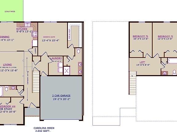 The Carolina Wren model is a distinctive semi-detached home that features a vaulted ceiling in the foyer, four bedrooms, (two on the first floor) three bathrooms, a beautiful living room, dining and kitchen area. Enjoy the convenience of the first floor owner's suite with a private bath, a large walk-in-closet and a nearby laundry room. The second floor has an open loft area, two bedrooms and a full bath. Bedroom four could serve as an office/study. An unfinished lower level, two car garage, and efficient natural gas furnace are just a few of the many included features.