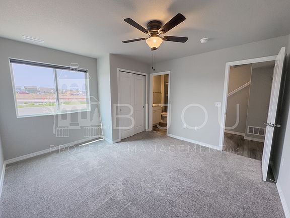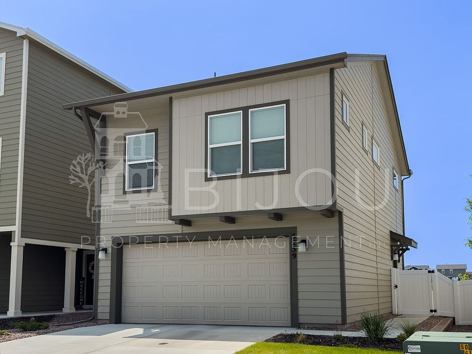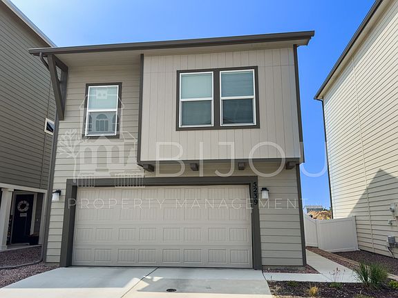Built just recently in 2023, with modern flooring, paint and light fixtures. Ideally located directly across the street from a neighborhood park, view the mountain range from around the home. Green spaces for our furry friends, allowed in this property. Upstairs is one bedroom with bathroom and full stand up shower, upstairs is the other bedroom with a door to the common full bathroom including a dual vanity. The living area, kitchen, and laundry area are all on the upper floor as well. Shelves in the laundry room add to the already ample cabinet space in the kitchen. Beautiful stone countertops, breakfast bar counter and stainless steel appliances. Prime location around the corner from Powers and Hancock Expressway. The one really won't last long!!