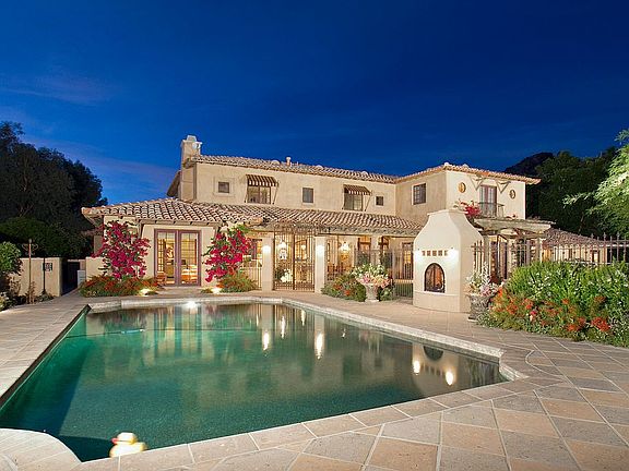 This remarkable European Style estate is perfectly nestled against the North foothills of Mummy Mountain on a private street just steps away from Paradise Valley's Exclusive Country Club. Designed by architect Mike Higgins coupled w/the finest craftsmanship, this home is truly superior in quality & style. Enter the foyer to the Cherry and stone floors mixed w/the vintage wood doors and custom iron work. The formal living room is grand yet comfortable w/fireplace, glass French doors and beamed ceilings. The perfect space for any style of entertaining. The luxurious master retreat boasts custom tile fireplace and hand painted beamed ceilings. The master bath includes his & her vanities, separate dressing areas, courtyards, separate water closets & walk in closets. Adjacent to the master are both the gentleman's wood paneled office and the lady's office, each with ceiling details, fireplaces and private courtyards. The gourmet kitchen offers Zinc counter tops with built in chop/block island, Wolf 6 burner range, Sub Zero 36" Freezer and Fridge, Warming drawer, 2 Bosch dishwashers & Miele Coffee System. Choose to dine in the comfortable breakfast room with fireplace, open to kitchen or the formal dining with wine cellar and glass French doors opening to private courtyard. Walk up the open sweeping staircase and capture the city light views as it leads to the four bedrooms each with designer quality touches and appointments and a large family room perfectly outfitted for flexible uses. The expertly manicured grounds and the romantic gardens create an element of charm and romance, with courtyards, fountains, pool, fireplace, various sitting areas all carved into the mountainside for true privacy. Every element of this home is fully custom constructed, decorated and finished.