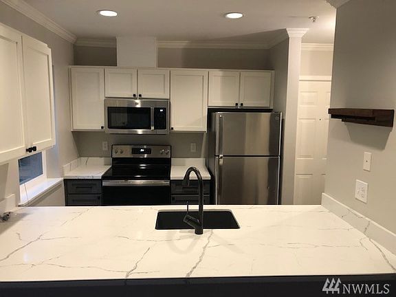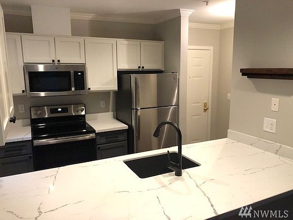Come see this totally redone back corner first floor unit. Its so quiet being away from the street. This unit has been totally redone from total bathroom remodel, to kitchen cabinets, to flooring throughout. New paint on every wall, bathroom vanity, and lighting ALL NEW! All new kitchen appliances still with warranty. All it needs is YOU. Easy walk to lower Queen Anne dining, to bus lines, and to trail along the waterfront. Off street secure parking means no lugging groceries thru the rain again. Very Low HOA dues and no rental cap. This unit is move in or rental ready for years to come.