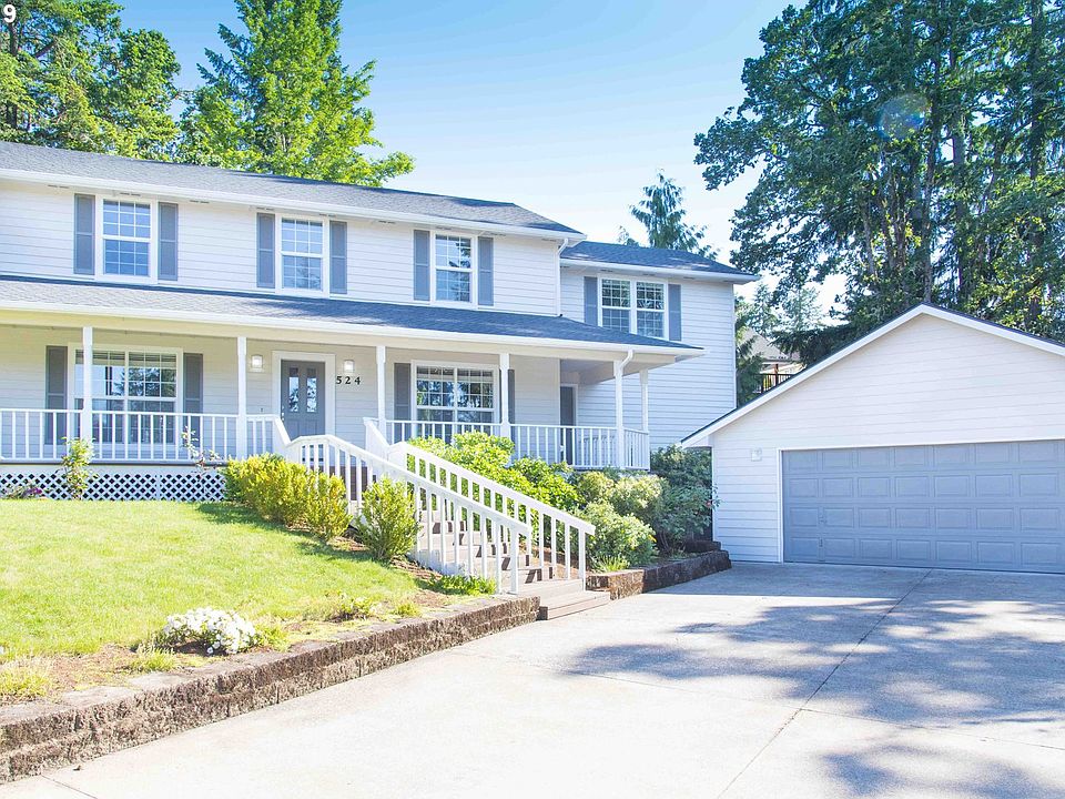 Stately and dramatic with wrap around front porch, nestled in a quiet cul-de-sac. Kitchen has an island, double ovens and view into lush back yard. Side door through mud room leads to enclosed hot tub. Secondary bedrooms have dormer windows and window seats. Master is huge and has large soaking tub and separate shower. New: roof, interior & exterior paint, ss appliances, granite counters, carpet, and glass shower doors.