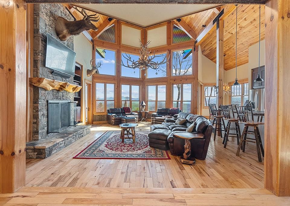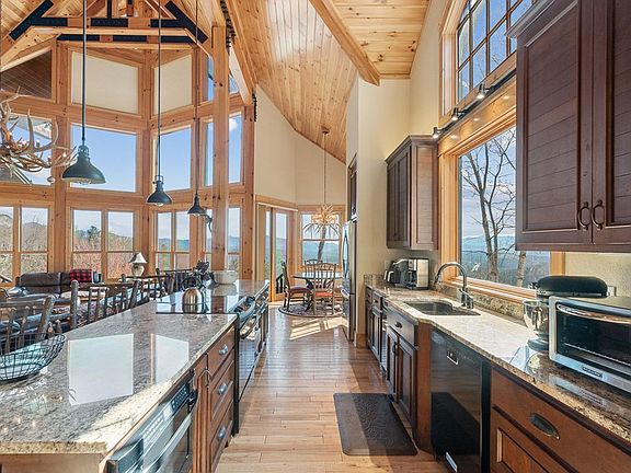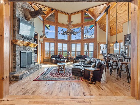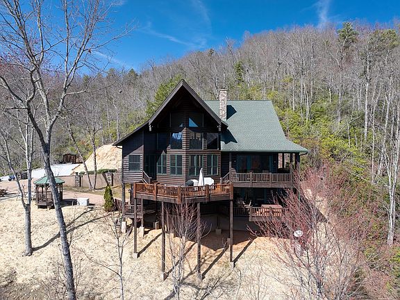 Welcome to your dream mountain retreat! Nestled on 11.25+/- acres, this log-sided home offers breathtaking views. This estate feels secluded, while just being 12 minutes to Franklin Main Street. The property is paved to the door, with a circular drive and plenty of parking. Exterior features include a hot tub, gazebo, and fire pit absorbing unparalleled Blue Ridge mountain views.The interior of the home is a true post-and-beam, 3 bedrooms with en-suites, vaulted ceilings, hardwood floors, and plenty of natural light filling the main living space. Entertain in the open floor plan and gourmet kitchen, plenty of room prepping and hosting guest. Cozy up by the wood-burning fireplace or enjoy panoramic vistas through tinted windows. The main level primary suite boasts a luxurious bath. The lower level features a second fireplace, guest bed/bath, and a family room with a pool table. Double garage with extra storage. Seller has improved decking throughout, created additional parking and circular driveway, improved retaining wall, new AC units, and various repaints since purchase. Experience mountain living at its finest—schedule your viewing today!