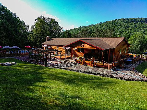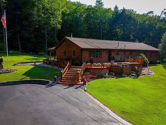 MOTIVATED SELLER: Virtual Tour available at https://youtu.be/s0sHYVL1HLk . ALL reasonable offers will be considered for this beautiful "forever home"!! Rustic elegance at its finest....all the bells and whistles. This 4275 sf custom log-sided home on 4ac in McKean County, PA has a heated pool, hot tub, area for grilling/outdoor entertainment, theater and fitness rooms, floor to ceiling wood burning fireplace and bar, pellet stove, whole house generator, not to mention access to hunting, fishing, hiking, horseback riding, and off road vehicle activities year round. Cathedral ceilings, carved woodwork featuring wildlife and fauna, and real stone, highlight rustic tongue and groove and logs thru-out this custom home. The open floor plan and detailing make for gracious living and entertaining, while providing serenity and privacy. Hosting a spacious 725 sq ft kitchen/dining area with stainless steel appliances, 725 sf livingroom/parlor area, large master bedroom with his/her closets and tiled bath featuring cathedral ceilings. French doors open to a private outdoor living area, where cedar decks wind thru a tropical paradise of palm trees, umbrellas, fountains, flora, and a flagstone patio. Two more bedrooms, full bath, and closets galore complete the upper level. The front entry opens onto spacious cedar decks with a view of the changing seasons. A large family room in the lower level features a wet bar, wood burning stone fireplace, and is adjoined by a theater room(2011), fitness room, play area, huge utility/laundry area, hobby/craft, third bathroom(2019), plenty of room for family and friends to visit. The 28 ft pool is heated with natural gas to extend the season, and has a log-sided pump house for accessories. A large Jaccuzzi (2018) features lights and a waterfall. You can enjoy the tranquility of this paradise with peace of mind 24/7 year round, with a whole house generator w/auto switch(2019). Though built in 1978, with a large addition in 1995, the entire interior and exterior of this unique home has an effective age of 20 yrs with most renovations, upgrades, and improvements added since 2010. Surrounded by mountains in your private back yard, on your deck, sipping your favorite beverage and enjoying time with your family. This home is well maintained, in pristine condition and is move-in ready! Located 80 miles south of Hamburg, NY, home to the Buffalo Bills, the property is a day trip to several major cities, providing diverse shopping, dining, cultural events, and close proximity to international airports. Welcome home!