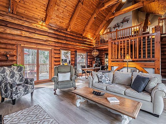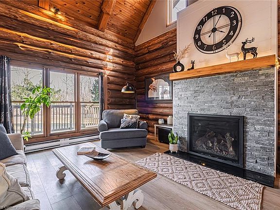 Nestled on just under three acres of peaceful countryside, this breathtaking 4-bedroom log home exudes rustic charm while offering modern luxury. A true piece of paradise, this property is surrounded by towering trees and natural beauty, creating a serene, Muskoka-like setting that feels like a retreat. Step inside to discover a gourmet kitchen featuring a dream 10-foot island, all-new stainless steel appliances, and plenty of space for entertaining and culinary creations.The great room is a true showpiece, boasting soaring ceilings and a striking fireplace wall that creates a warm, inviting, and unforgettable atmosphere. Perfect for gatherings or quiet evenings by the fire, this space embodies both elegance and comfort. Convenience meets functionality with a main-floor laundry room and a versatile bedroom or office space. Upstairs, the primary suite is a true retreat, complete with a walkout to the upper deck that is perfect for enjoying serene morning coffee or sunset views. The newly finished basement adds even more living space, featuring a cozy rec room with a fireplace and two additional oversized rooms, ready to be transformed into a home gym, media room, guest room, or anything your heart desires. Outdoor living is second to none, with expansive decks perfect for entertaining, a relaxing hot tub, and a fenced-in yard area—great for pets, kids, or gardening. Adding to the property’s appeal are two additional outbuildings, offering endless possibilities for a workshop, extra storage, or even a playhouse. Close to the Grand River and Lake Erie beaches, this home offers easy access to outdoor adventures like boating, fishing, and hiking. With quick access to shopping, recreation, and schools in Cayuga, and just a short drive to Hamilton, this property provides the perfect balance of seclusion and convenience. Surrounded by nature yet offering all the comforts of home, this exceptional property is a must-see!