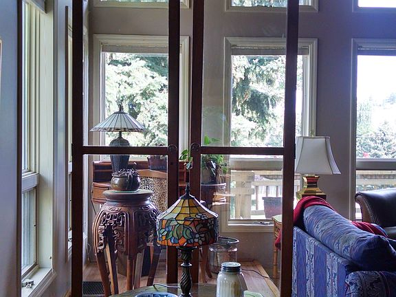 Views, views, views and light filled. Wonderful location. Private yet close to everything, Fabulous tongue and groove cathedral ceilings. An open floor plan. 2 decks and a patio. Separate playhouse/artist's studio w/electricty. Detached 4 car heated garage with workshop and 3/4 bath. Gas fireplace. New furnace, air condtioning and hot water heater 2018.