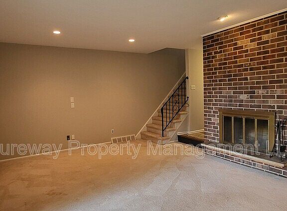 Carpeting throughout the living room, stairs, second-floor hall, and all three bedrooms.