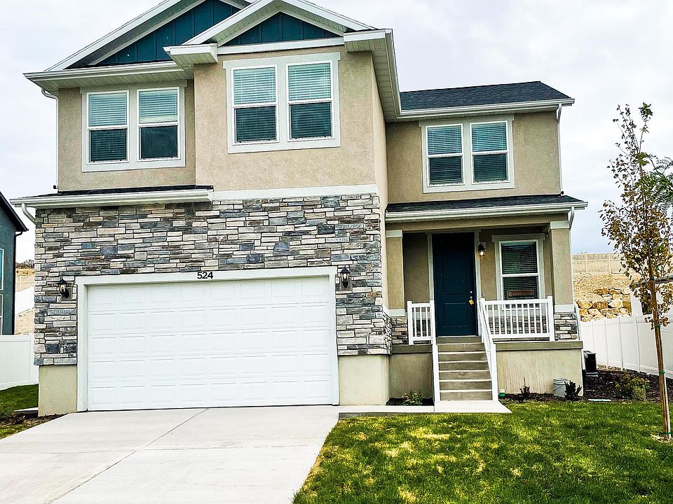 Welcome to Saratoga Springs, a quickly growing city close to movie theaters, Walmart, Costco, Fast Food, and Thanks Giving Point! Large roman style doors welcome guests into this lovely home where a spacious living room, with bright windows, invites friends and family to settle in. The kitchen features Whirlpool appliances, ensuring solid quality performance. The kitchen has ample storage and space for a large dining set and an island for bar stools. The "Jesse Design" for this home features a large master room with a custom walk closet, a separate tub from the shower, and the toilet in its own space with a closed door. Additionally, the double sink is spacious and lined with several lighting options. Three other bedrooms and the large laundry room share the same floor, ensuring a safer feeling for families. The basement is unfinished. This lovely community has a quiet, friendly, and easy-going atmosphere. The community has new homes, a modern feel, and a park just around the corner. This home has a two-car garage, and additional parking has been added via a large gravel driveway along the side. The backyard has a retaining wall and will be designed in the summer. -Utilities are covered by renters -Pets allowed with nonrefundable deposit and monthly fee -$500 non refundable on security deposit -6 to 12 month term lease