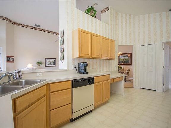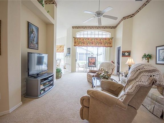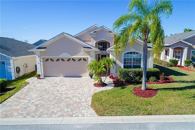VERY WELL MAINTAINED RidgeDale model home located in the 55+ community of High Vista, within the gated golf course community of Ridgewood Lakes. The oversized brick paver driveway and walkway leads you to the front door of this lovely home. Thru the entry foyer, you will find a living room and dining room with dramatic twelve foot ceilings. The kitchen is large and sunny. There is a built in desk in the kitchen along with THREE pantries. The master bedroom is in the rear of the home and the master bath was updated and is stunning! The guest bedroom, bathroom, and linen closet are in the front of the home. This bathroom as well is absolutely gorgeous! The A/C was replaced in 2010 and a new roof was put on in 2015. The entire home has been repainted and has new carpet. Inside laundry room comes with a two year old Matag washer & dryer. Located near I-4, shopping at Posner Park, movie theater, medical offices, hospital and within a short commute to the area attractions. The resident owned community clubhouse was totally remodeled and has many planned activities. Ball room, card room, library, arts & crafts room, fitness center, pub, game area, outdoor HEATED pool with hot tub, shuffleboard, tennis, pickle ball will keep you FULL TIME busy! The monthly fee of $155 covers your lawn being mowed, tier two cable TV through Spectrum (additional pkgs. may be purchased) and use of all the High Vista amenities.