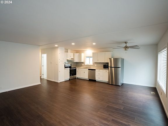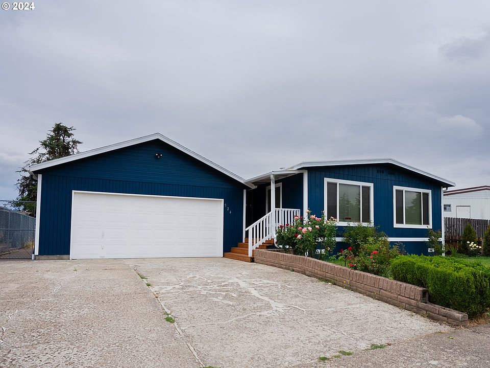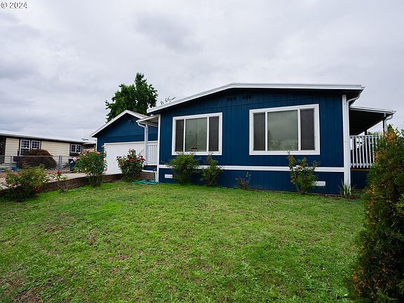 A tastefully refreshed manufactured home located on its own land (no space rent). Both bathrooms and the kitchen have been updated. This home has vinyl windows, new flooring, new interior and exterior paint. The 2 car garage is a great space that also has a pass through door in the back for easy access to the backyard. The backyard is fully fenced and ready for pets and/or children. This home is vacant and move-in ready.