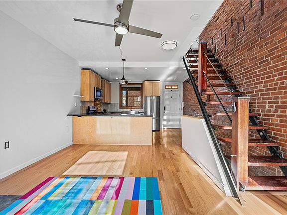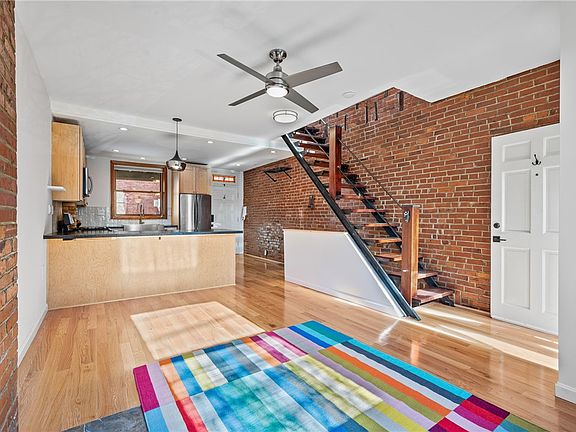 Tidy end unit brick rowhouse, just one block from West Penn Hospital in the heart of Bloomfield, and less than 1.5 miles to CMU and Pitt, close to Children's Hospital, bus routes, bike lanes. Open floor plan with solid oak floors in the living room and remodeled kitchen with maple cabinetry and ample counter space. Sheltered patio with gas grill and built-in table. New windows, central AC, and ceiling fans for comfort during all seasons. Large, clean, dry basement for extra storage or workshop space. Second floor holds a very large bedroom with bath, and access to the deck. Walk to dining and nightlife along Liberty & Penn in Bloomfield and Lawrenceville. Live/Work/Enjoy!