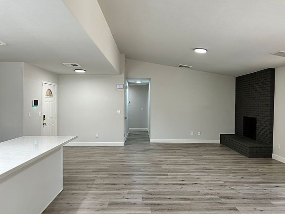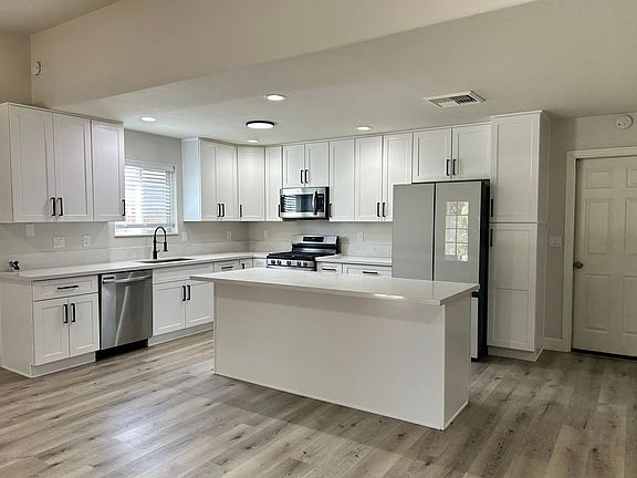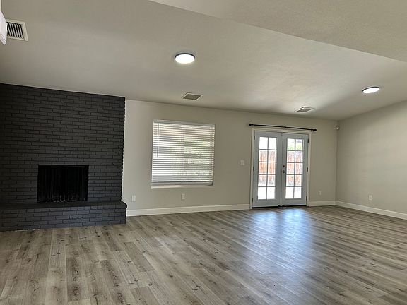 1657 Sq. ft five bedroom, 2 bathroom house with vaulted ceilings. Xeriscaped front yard with a front walk way that provides two skylights as you walk up to the front door. Large open kitchen with quartz counter top, kitchen island, stainless steel appliances, Bespoke double door refrigerator, built in microwave and deep under-mount kitchen sink. Open dining and living room. Dinning area has French doors which leads to huge covered patio and backyard area, great for entertaining. Backyard also has two sheds. Living room has floor to ceiling wood burning brick fireplace. Primary bathroom has an en suite with a stand along shower that includes bench seating. Full guest bathroom. Water resistant Luxury vinyl faux wood flooring throughout. Washer/Dryer hook-up in garage area. Central Air forced air heating, and master cooler. This property also has solar. Bespoke double door refrigerator will be provided but not warrantied.