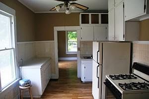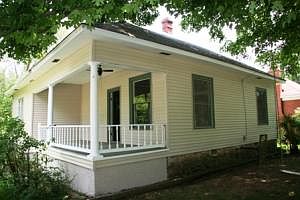 Home on corner lot with small chain-link fence yard area. Covered front porch. Interior features tall ceilings, hardwood floors. Master bedroom on the main level with a sitting room.
