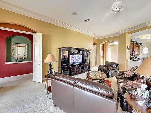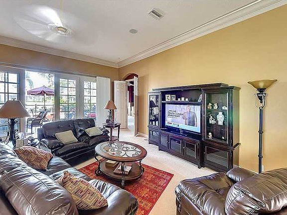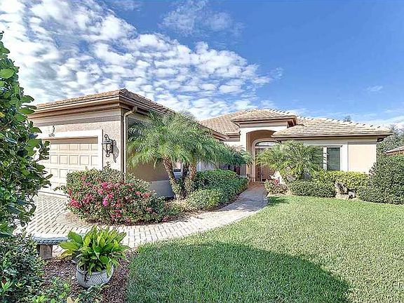 What a truly gorgeous home this is, having 2 bedrooms, 2 baths, a spacious den (or third bedroom option), with lovely French glass doors, and a built-in two person work room, hidden behind a pocket door! How clever, desk mess will never show! And... there is a gorgeous, expansive and peaceful lake view, too! Extras galore abound in this home, with a customized floor plan; triple crown molding; a beautiful kitchen with raised panel cherry cabinets, with crown trim and roll-out shelves, pan drawers, granite counters, a center island work station, tray ceiling and a nicely sized cafe'area, with sliders to the private side courtyard; mega storage with custom built-ins everywhere; surround sound speakers in the ceiling; an elegant master bedroom suite having 2 closets, with built-ins, a bay window, a Roman shower and garden tub; radiant barrier and hurricane 3M film on the Pella windows, for energy efficiency; a wider and deeper garage with a work area, a sink and lots of storage; a pretty paver brick driveway and walkway; a beautiful heated pool/spa; top-of-the-line everything! You'll love it here in this friendly neighborhood, and the semi-private golf, tennis and country club membership is optional.