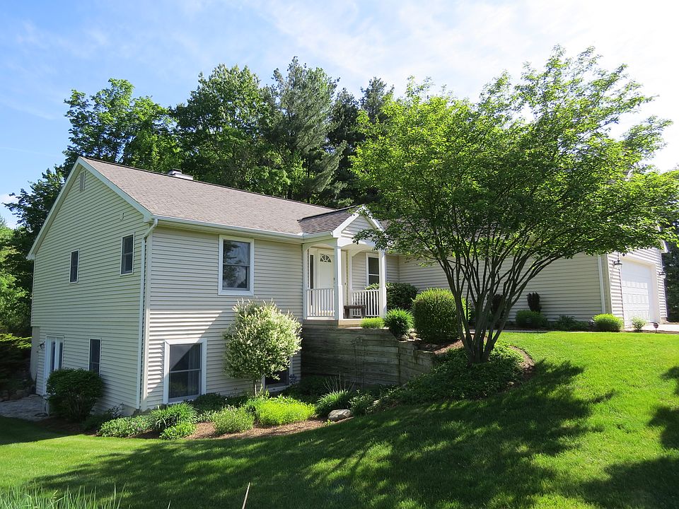 Quality built by Don Bondarenko with 2,300 sf of finished living space on 10 acres. Front foyer for welcoming guests has 2 glass side window panels. Gorgeous maple cabinet kitchen and center island work space well lit from recessed lighting. Quartz counter tops and tile back splash top cabinet storage plus pantry. Maple flooring is great coordinating choice. Three season room overlooking this tranquil, recreational setting of woods and pond with 8' slider to 2 tier deck. Ground water pond is stocked with bass, blue gill and cat fish and has beach with dock for paddle boat or canoe. First floor mudroom/laundry and convenient half bath off kitchen area. Spacious living room with awesome views, wood burning fireplace and built in speakers for sound system. Master suite has 2 closets and totally remodeled bath with walk-in tile shower, soaker tub, built in speakers, heat lamp lights and dual sink vanity all with tasteful tile onyx accent detail. Lower level family room with wonderful sound system.
