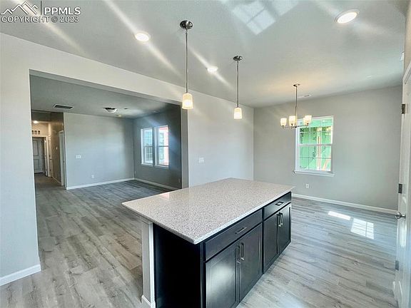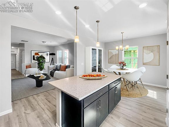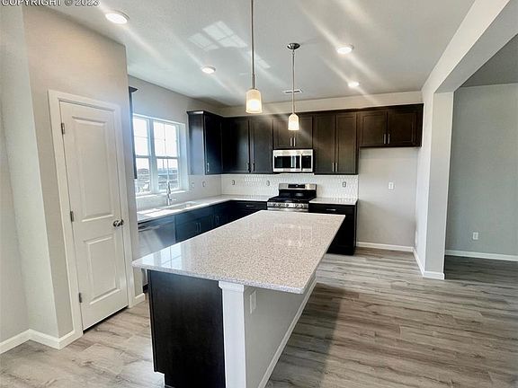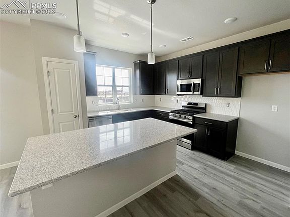 The open-concept Parque floor plan features a main level primary bedroom with en-suite bath including separate vanities, quartz counters, stand-alone shower with bench seat, and large walk-in closet. Gourmet kitchen offers a large center island with eating bar, quartz counters, pantry, tile backsplash, and stainless steel appliance package with refrigerator and gas range included. Custom metal railing at stairs and LVP flooring throughout main level living areas. Upper level bedrooms both feature walk-in closets. Convenient upper level laundry room with washer and dryer included, builder will also include window shades! Tons of great standard and energy saving features including 9’ ceilings on the main level, A/C, tankless water heater, radon ready (vent and pre-wire), dual pane windows, and generous insulation package. Enjoy all that Wolf Ranch has to offer including fenced courtyards, large green space common areas, pool membership, dog park, walking/biking trails, Wolf Lake with fishing, kayaking and paddle boarding. Easy access to D-20 schools, gyms, hospitals, the Powers corridor, and I-25.