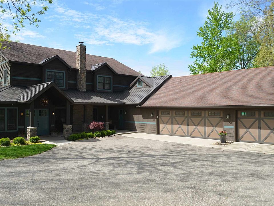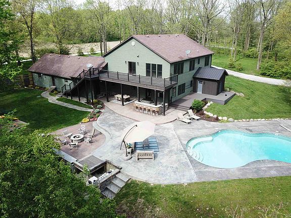 This inviting, quiet, lavish homestead is embedded in over 21 sprawling wooded hillside acres. This home is overflowing with custom and unique craftsmanship. In 2014 the entire home was taken down to studs and redesigned. The attention to detail is extremely evident in the custom cabinetry throughout, coffee bar w/ butcher block counters, real oak floors, wood burning fireplace, his and hers offices, two jack and jill bathrooms upstairs w/dual vanities, zoned heating and cooling throughout the house, and even a doggie shower! The master retreat boasts a large his and hers walk in closets, heated tile floors, tile shower and very large cozy tub. The home has over 5000 square feet of living space with 5 bedrooms, 3 full baths and 2 half baths. Enjoy the spacious living room along with exquisite eat in kitchen featuring granite counter-tops, custom cabinets & walk in pantry and all new appliances. The large mudroom and laundry room off the over sized heated three car garage with drains and water allows everyone to play and enjoy the land and amenities of this property. Stepping outside you will experience professionally landscaped and irrigated grounds surrounding the home with the playground, propane fire pit, heated saltwater in ground pool, basketball hoop, loaded outdoor kitchen and manicured trails all under the canopy of the beautiful well established trees embracing the wilderness. And there's more! The expansive pole barn is truly a mancave above the rest. This cave is partially temperature controlled and has 5200 square feet with an efficiency kitchen, 3/4 bath, exercise room, large game room, 50 x 25 RV pull though parking with waste dump, 1 ton jib crane and storage beyond your imagination. This is quite possibly one of the most unique and luxurious homes you'll see off the water!