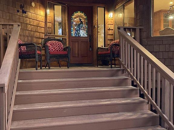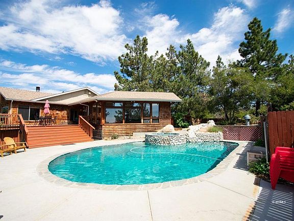 This Rustic yet Elegant Idyllwild Mountain Home is on 1/2 acre with a pool/Jacuzzi. Views overlooking the valley and boarders the U.S. Forest land. This 5-bedroom, 3.5 bath home measures a spacious 4,158 sq. ft. Room for the whole family. A great entertainment home. The living room and dining room have vaulted ceilings with walls of windows overlooking the pool and the magnificent views. The large gourmet kitchen has maple cabinets, stainless steel appliances and jet-black quartz counter tops. Still on the main level you have the large main bedroom and bath, two additional bedrooms with a separate bathroom. Downstairs are an additional two bedrooms, 2 bathrooms, family room, a bonus room'(presently walled with mirrors as was once a dance studio), and a fun game room with a pool table and arcade games. This one-of-a-kind Idyllwild home sits back from the street with a large circular driveway with plenty of parking. This is a beautiful turn-key home, and all contents are included with the sale.
