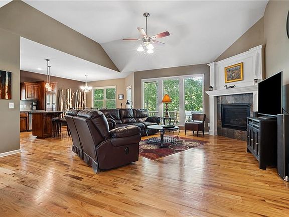 Discover the epitome of modern living in this immaculate Reverse 1.5 Story home. From the moment you step inside, you'll be captivated by the open floor plan and gleaming hardwood floors. The spacious living room, complete with fireplace and wall of windows overlooking serene treetop views, creates the perfect ambiance for relaxation or entertaining. The gourmet kitchen is a chef's dream, boasting a gas range and a large granite island. The adjacent dining area seamlessly connects the heart of the home.