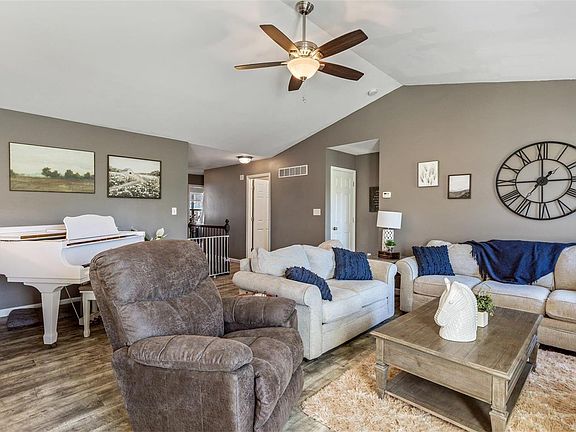 Welcome to this inviting ranch-style home with vaulted ceilings that create an open and airy living space, making every room feel spacious and bright. This 3 bed 2 bath gem features luxury vinyl plank flooring in the living areas providing a touch of elegance and durability to your everyday living. The eat-in kitchen is the heart of the home, offering the perfect space for family gatherings and casual dining, complete with a convenient breakfast bar. Master Bed Suite features walk in closet and full bath with comfort height vanity with double sinks. Enjoy the convenience of main floor laundry, making daily chores a breeze. The open stairwell leads to an unfinished lower level with a full bath rough-in and an egress window, offering the potential to create your dream space. Large level fenced in rear yard for all the family fun! 2 car garage, close to retail, restaurants, library, elementary school and walking trails!