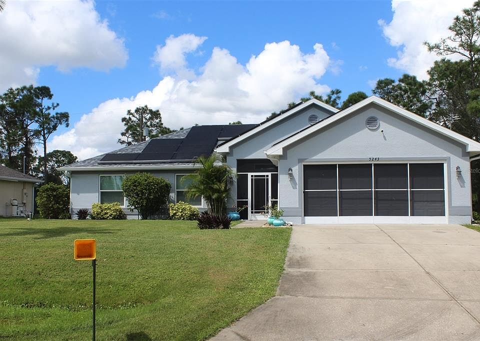 Spacious 3-Bedroom Home with Bonus Room, Heated Saltwater Pool, Sunrun Solar, and Extra Lot. Discover your dream home in this stunning 3-bedroom, 2-bathroom property with an additional bonus room that can serve as a 4th bedroom, office, or playroom. Located on a beautifully landscaped half-acre lot, this home offers the perfect combination of comfort, energy efficiency, and luxurious outdoor living. Heated Saltwater Pool & Spa: Relax year-round in your heated saltwater pool with an attached spa. The pool deck features elegant brick pavers, and the lanai comes equipped with a convenient roll-down sunshade for extra privacy and comfort. Energy-Efficient Living with Sunrun Solar System: This home includes a Sunrun leased whole-house solar system that is assumable by the new owner. With an average electric bill for 2024 of just $41.50 per month, you'll enjoy significant energy savings. Plus, **Sunrun maintains the system**, providing hassle-free, eco-friendly living. Spacious Kitchen: The modern kitchen boasts stainless steel appliances, including a range with a double oven, and stylish butcher block countertops—a perfect space for cooking and gathering. Primary Suite: The spacious primary bedroom includes a large en-suite bathroom with a dual-sink vanity, walk-in shower, private toilet area, and a generous walk-in closet. Outdoor Living: Enjoy an extra lot with a 10x20 shed for added storage, rain barrels for eco-friendly watering, and a partial drive with culvert for even more space—perfect for a boat or RV. Additional Amenities: Interior laundry room with washer and dryer included, newer double-pane windows with hurricane shutters, city water access, and a beautifully landscaped 1/2 acre yard. New roof installed in 2023 provides lasting durability and peace of mind. The AC system has a UV blue light filter that's used in HVAC systems to improve indoor air quality This home offers a rare blend of modern convenience, energy efficiency, and luxurious outdoor living, making it a must-see property!