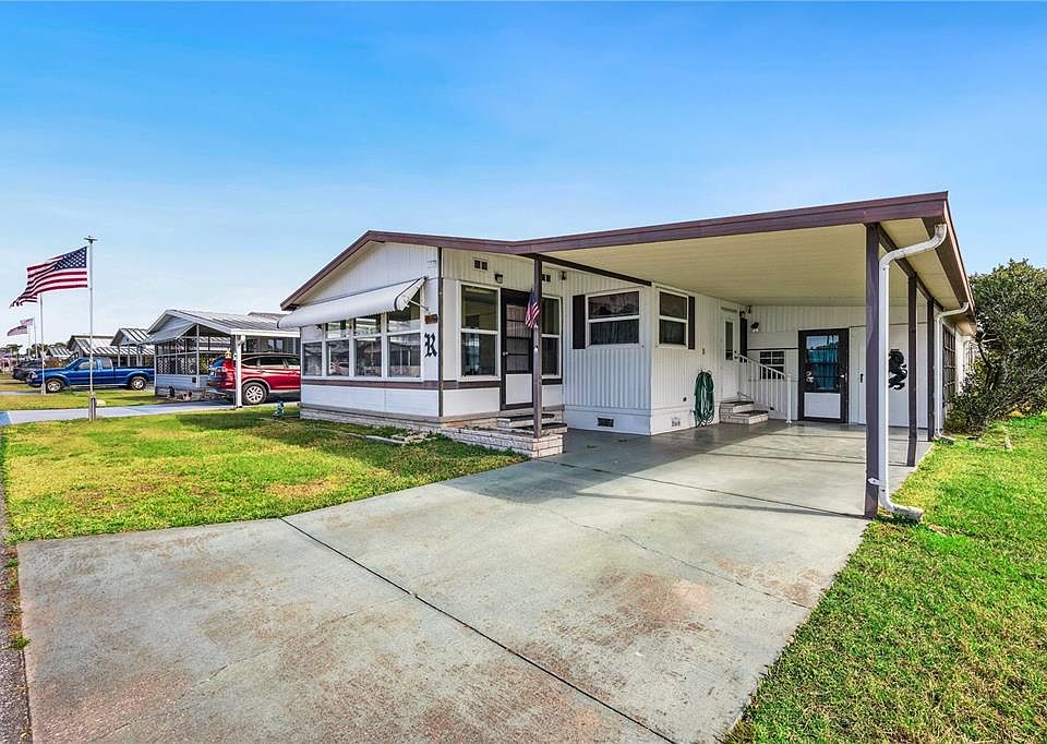 Looking for a pet friendly Florida neighborhood? Discover this exceptional FURNISHED home in the Oaks Royal in a 55+ community, where you own your land! This beautifully maintained two-bedroom, two-bathroom doublewide manufactured home is sure to impress. Featuring a spacious open-concept layout connecting the kitchen and living room, this home is perfect for comfortable living and entertaining. Recent updates including modern kitchen cabinets, energy-efficient double-pane windows, durable Berber carpeting, and a charming enclosed front Florida room. The primary bedroom is spacious enough for a king size bed, features a ceiling fan for added comfort, and large walk-in closet for ample storage, and cozy carpeting underfoot. The second bedroom comfortably fits a queen bed and includes built in closet for convenient storage. The bathroom features durable vinyl floor, step-in shower and stylist vanity. The laundry is located off the carport in a large storage area and includes the washer and dryer and a work bench for added convenience. The central AC/Heating unit is a 2024 and home has metal roof over. A low annual HOA fee of $450 gets you access to all the park amenities. Note this home/community will qualify for VA or FHA financing. Schedule your appointment today and don't let this one get away!
