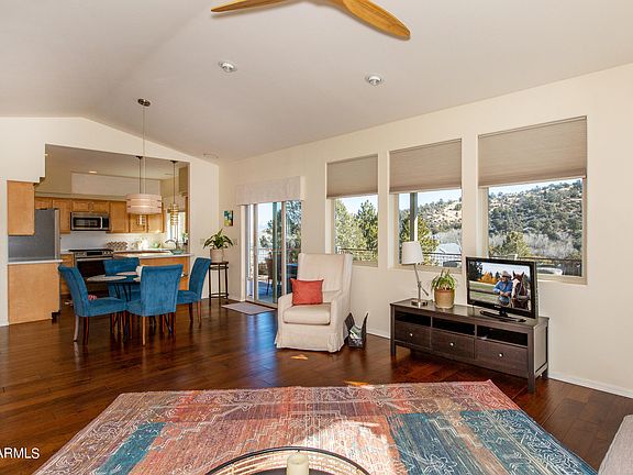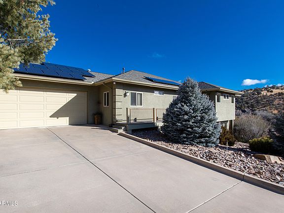 What a find! Beautiful home w/ VIEWS located in Creekside of Prescott. 5 bedroom, 3 bath w/ desired one level living while having additional separate living accommodations downstairs. Main level features great room w/FP, kitchen, primary bedroom w/sitting room, 2 way FP, beautiful master bath, 2 walk in closets & access to laundry room. 2 more bedrooms, full bath & 2 car garage. Enjoy taking in the views while sitting on the 400 sf trex deck. The downstairs offers large living space, sitting area, 2 additional bedrooms & 1 full bath along w/ kitchen, w/d hookup, pantry, sprinkler system & ample storage space. A separate entrance w/ its own parking pad allows opportunity for multigenerational living or investment option. New roof & water heater in 2021 & owner owned solar system. More... Home is wired for security and has sound system with 14 speakers. Foundation is constructed with the energy efficient RASTRA Block