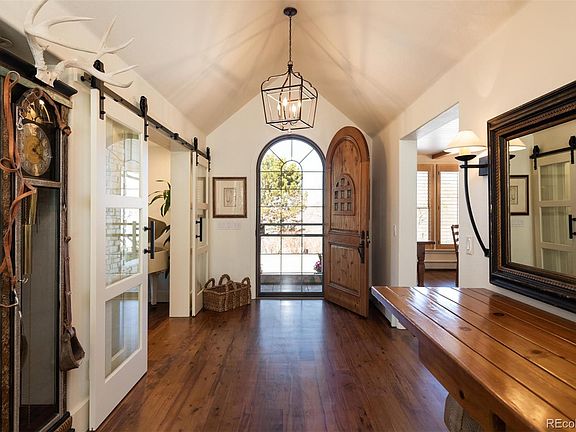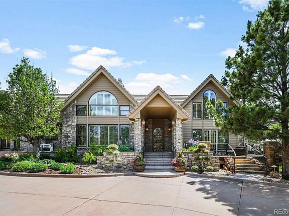 Secluded retreat in the exclusive gated community of Castle Park Ranch. Custom, remodeled ranch estate is conveniently located just minutes from Castle Rock and Parker. The rare, 35-acre lot, provides a peaceful and private lifestyle! Updated and fully remodeled ranch plus a private 2,100+ sq ft barn, landscaped grounds including gardens and water features all surrounded by native foliage and sprawling views. Enjoy the numerous updates in this sprawling ranch-style custom home affording numerous terraces and convenient indoor/outdoor living throughout. Rich with custom woodwork, gleaming cypress wood flooring, large windows and vaulted ceilings, each room captures the beauty of the surroundings. Bright and airy, the upgraded gourmet dine-in kitchen is outfitted with sleek granite counters, top-of-the-line appliances and conveniently neighbors the formal dining room. Two story great room with floor to ceiling stone fireplace, custom built-ins opens to the back terrace and private pool. Additionally, the main level features a custom home-office, elegant living room, versatile loft and a remodeled mud room/laundry room. Luxurious and private, the main-floor master suite features a stone fireplace, private access to the pool, and a stunning master bath & custom walk-in closet. Upstairs you'll find three bright and light-filled bedrooms plus two well-appointed full bathrooms and an abundance of storage space. In the lower level walk-out you'll find an expansive family room with fireplace and custom bar, multiple doors that expand to the inviting backyard and lower terraces. Open and spacious home-gym, private guest bedroom and bath plus ample storage space all round out the lower level. Outside you'll enjoy the lush lawn with a private tee-box and a private pool surrounded by resort-style terrace, gazebo and fire pit.