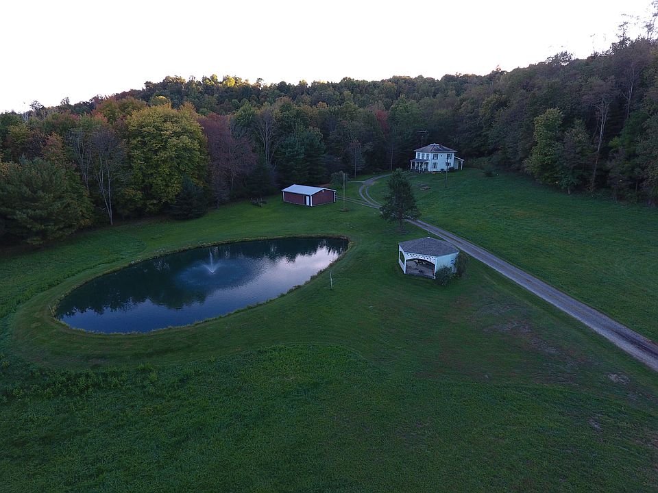 quiet corner lot,country setting with stocked pond and creek along property frontage, gazebo, mineral, oil, and coal rights free natural gas available, saleable timber. Lots of wildlife (deer, turkey, rabbit, squirrel) profitable hunting. two wells on property, (one spring fed, one deep), Electric power in both garages and gazebo