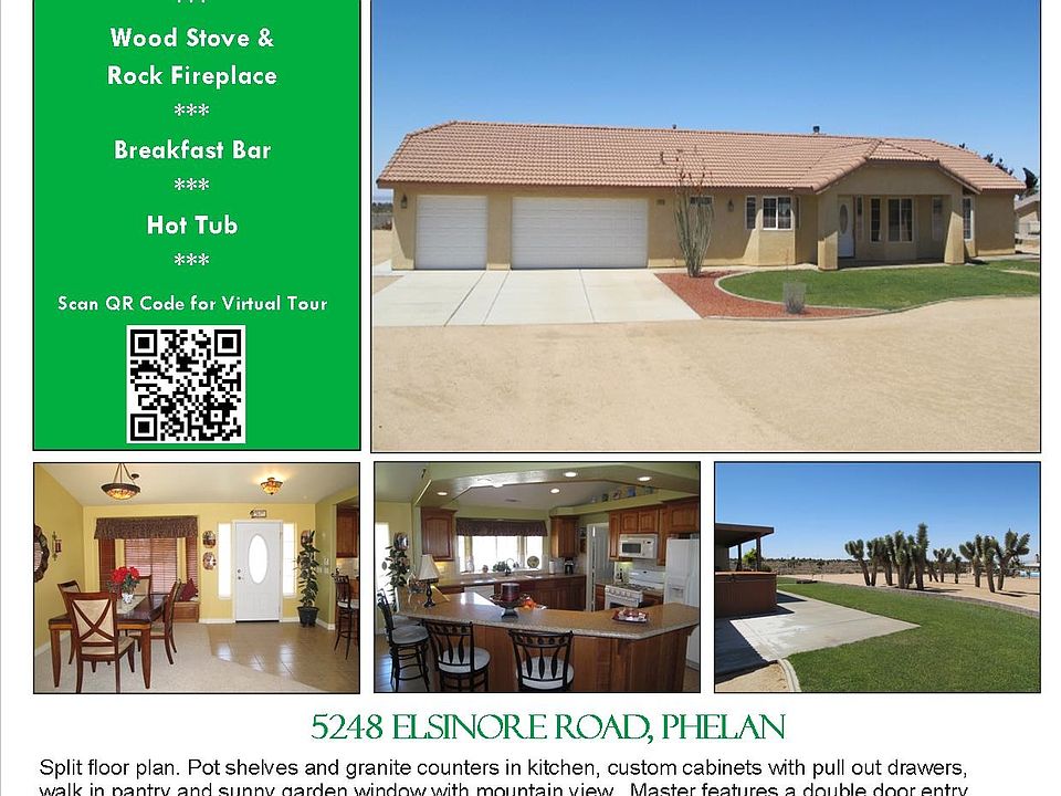 Split floor plan. Pot shelves and granite counters in kitchen, custom cabinets with pull out drawers, walk in pantry and sunny garden window with mountain view. Master features a double door entry, ceiling fan, fireplace, pot shelves, dual sinks, walk-in closet, separate shower, tub and patio access. Cozy wood stove with river rock in the living room. Front and back sprinklers with timer. Dog run. Pretty as a picture well groomed and manageable lot size with lush front and rear landscaping.