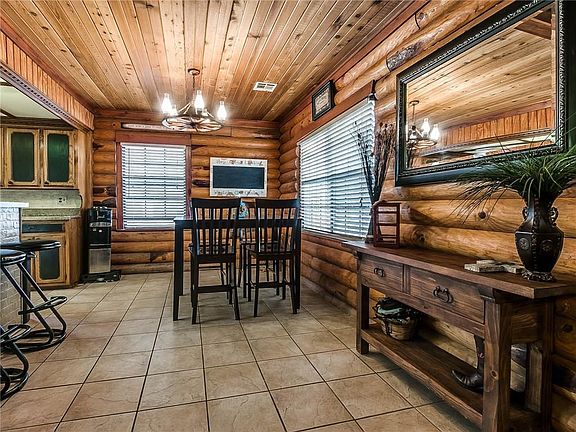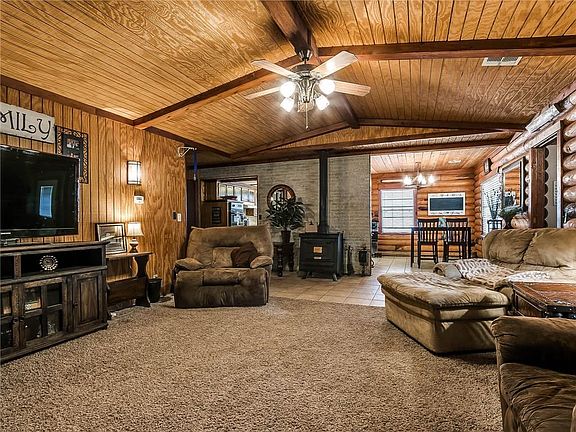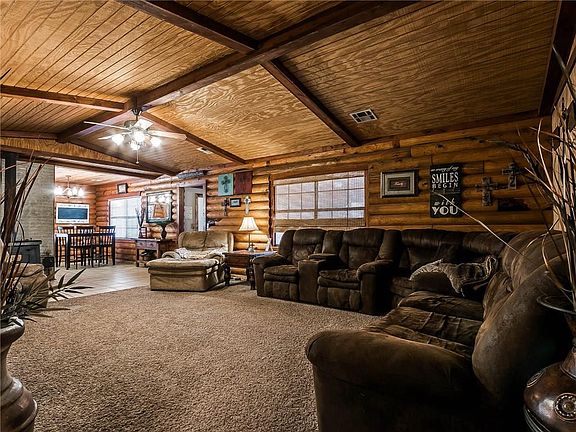 Oak tree wooded entrance offers a private setting to this beautiful log cabin sitting on over 6 acres! 4 bedroom, 2 1/2 bath with an incredible master suite added in 2013. Master suite has 20 ft cathedral ceilings, bay windows with picturesque views, oversized jacuzzi tub, walk-in tiled shower and a HUGE closet. Interior safe room. Living area and kitchen are spacious with an open concept. 1100 square foot shop, carpeted and spray foam insulated is an awesome detached gameroom. Cross fenced for two pastures and set up nicely for horses. Beautiful property with great access fronting Hwy 74/Portland Ave.