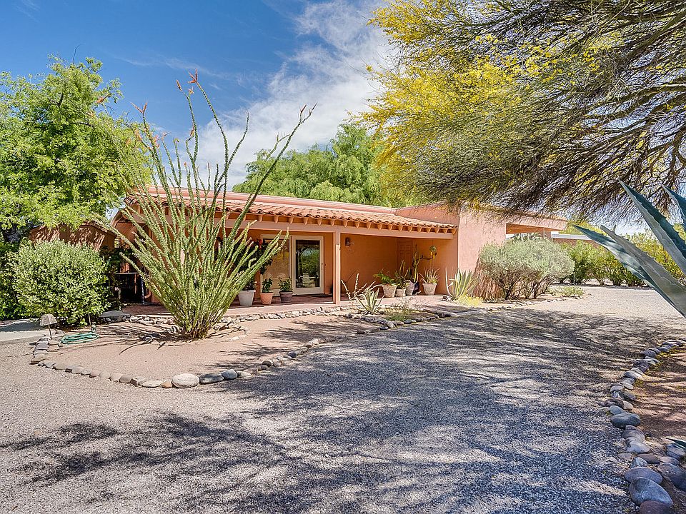 Charming mid-century ranch style home on a large lot with mature landscape including oleanders lining all sides of back yard making it feel very private. 2-bedroom, 2-bath with den/office space and a bright Arizona Room that wraps two sides of the home. dual pane Pella windows on front of house and new carpet. Covered brick patio on front and large brick patio in back. Large outdoor storage space and additional storage closet in carport. Plenty of space on east side of home to store an RV or build a garage. Walking distance to Vail Middle School.