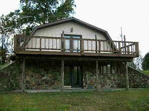 Very unique home on 3.37 acre tract. Lower level with open concept living room w/stone fireplace and kitchen, Full bath, and large utility/mechanical area. Upper floor w/2 bedrooms and full bath. Large deck overlooking nature's playground. 30X30 pole barn. Some highway road frontage.