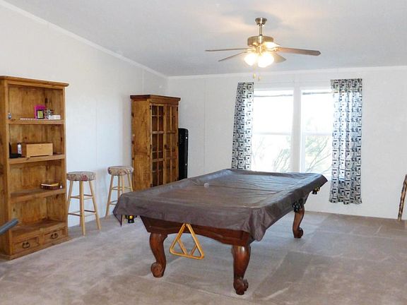 Well cared for & upgraded Palm Harbor manufactured home on 1 acre w/ mountain views in all directions!! Front entry opens to large living/dining combo. Spacious kitchen with island, tons of cabs, Moen faucets throughout home. Eat in kitchen area w/ slider to covered patio, adjacent to family room with wood burning fireplace w/ attractive mantle. Double doors open to Master suite sitting area/office, substantial bedroom area w/ well planned bath, featuring dual sinks, soaking tub, shower, walk in closet. BRs 2 & 3 share jack&jill bath, while BR 4 has access to the half bath. Large laundry room. Side door access to circular drive, carport & 20'x18' workshop w/ hot & cold water in utility sink. Quality ceiling fans, lighting, disposal. Enjoy mature natural vegetation on your desert oasis!